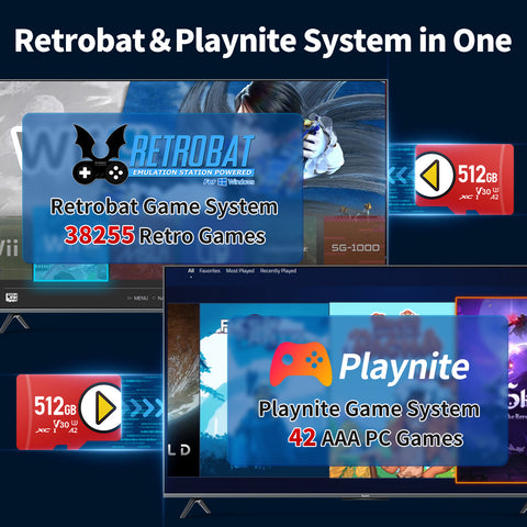 ➜This game card is pre-installed with retrobat, playnite system, 50 emulators and 38200+ games, and also includes 42 AAA games, no download required, just plug and play!