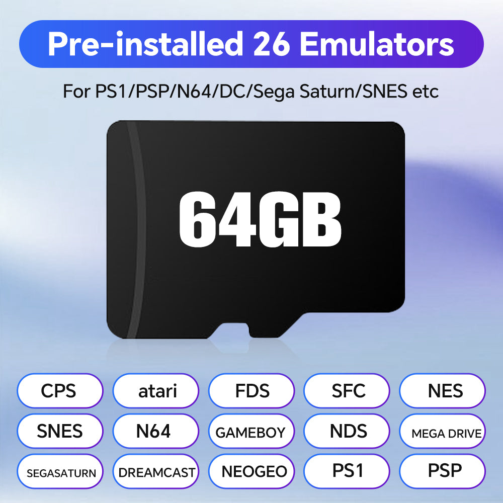 Dear friends, for your convenience, we provide you with a 64GB game card in this handheld game console, which is pre-installed with 18,000+ games. It is plug-and-play and contains a variety of game types. You can consult our online customer service for a specific game list.