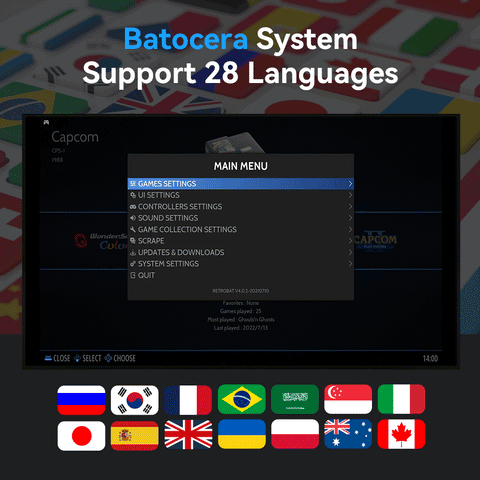 The batocera system supports 30 system languages, which can almost support buyers from all over the world, switch the language you need with one click, without any language barriers