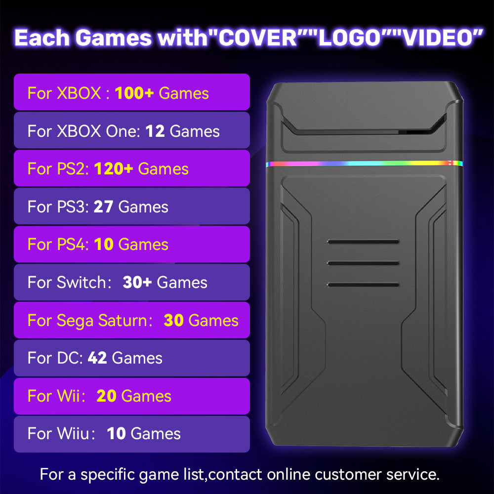 According to buyer feedback, in this launchbox hard drive, we have pre-installed many large popular simulators for you, which are compatible with XBOX, XBOX ONE, PS1, PS2, PS3, PS4, Switch, Game Cube, Wii, WiiU, N64, DC, Sega Saturn, NDS, SNES and other simulators and other large simulator games. It is the most fun hard drive at present.