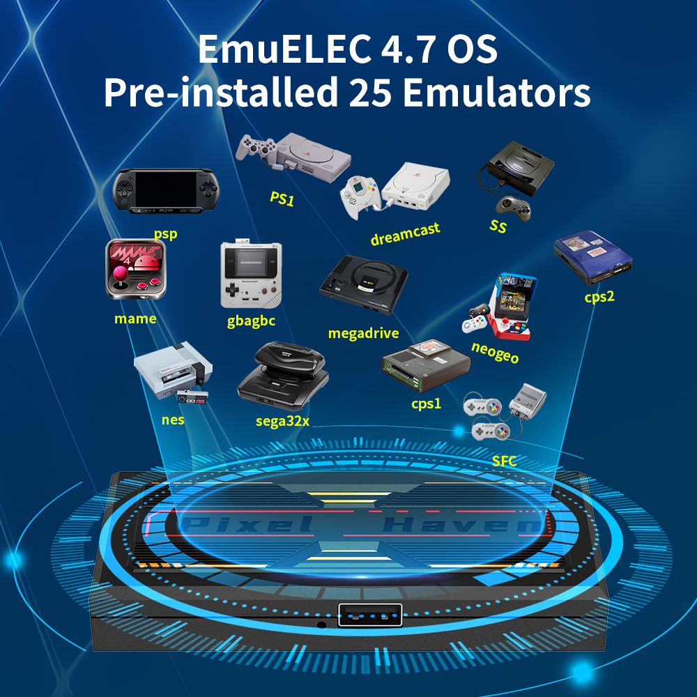 This game console comes pre-loaded with 25 top classic emulators, covering everything from for CPS arcade fighters and Dreamcast classics to beloved Sega, and PS titles.