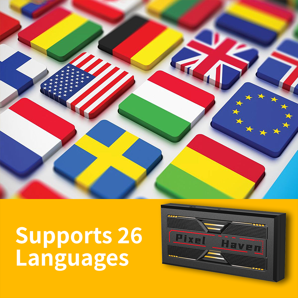 The Pixel Haven Game Console comes pre-installed with EmuELEC 4.7, supporting over 20 languages and breaking language barriers for global use. Languages include English, French, German, Spanish, Portuguese, Russian, Japanese, Korean, and Arabic, covering most countries' languages. The background language settings can be adjusted as needed.