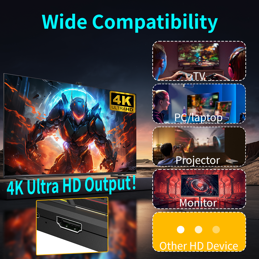 Pixel Haven Game ConsoleNo downloads, no installations, no complicated setups,Just plug the game system directly into any TV or display with an HDMI-Compatible port, and you're ready to play. Whether on your big-screen TV, monitor, or projector, pure gaming joy begins the moment you connect.