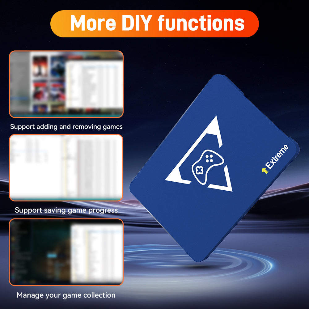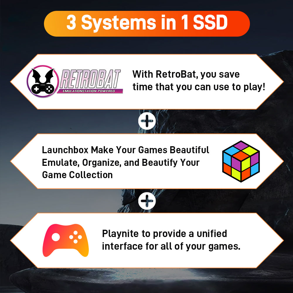 This 2TB Retro gaming SSD supports 80+ emulators, including large 3D emulators, for PS1, PS2, PS3, PS4, PS5, XBOX, XBOX ONE, NGC, SWITCH, WII, WIIU, N64, DC, MAME, and more.