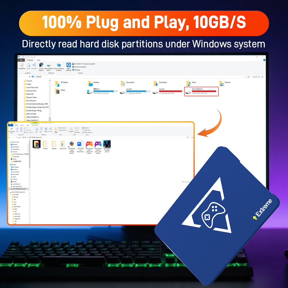 Hyper Base Play Zone 2T Gaming SSD is a true plug-and-play external SSD. It seamlessly reads Windows hard drive partitions, allowing effortless game management—add, remove, and run games directly. No drivers, setup, or installation needed.